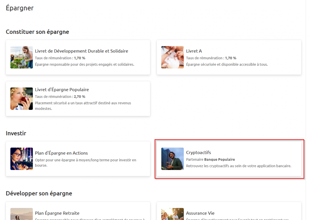 Envie d’investir dans les cryptoactifs ? Découvrez notre offre en vous rendant sur votre banque à distance dans l’espace « Souscrire », section « Epargne », sous-section « Développer son épargne » et suivez les étapes ci-dessous :