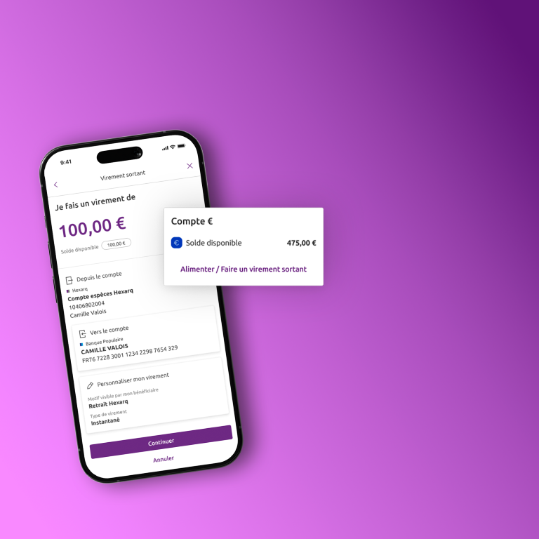 Vous disposez d’un compte € adossé à votre portefeuille. Vous pouvez l’alimenter simplement par virement depuis votre compte courant, vous donnant par la suite la possibilité d’acheter des cryptoactifs. A l’inverse, vous pouvez récupérer vos fonds à tout moment en réalisant un virement instantané et gratuit depuis Hexarq.